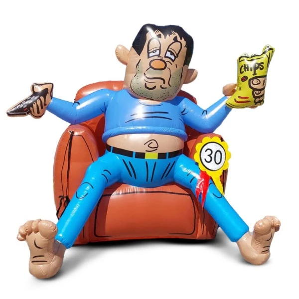 Deze man zit op zijn stoel naar de TV te kijken, met wat lekkers in zijn hand. De ideale pop voor iemand die graag lekker onderuitgezakt op de bank zit.