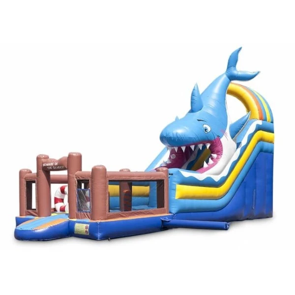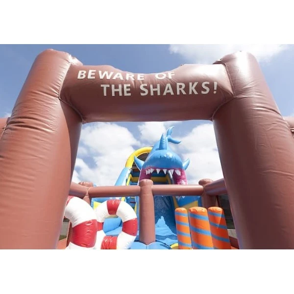 Deze supergave giga attractie in Haai thema van 6,4 meter hoog is vanaf ver al goed te bewonderen! Een combinatie van springen, klimmen & glijden!