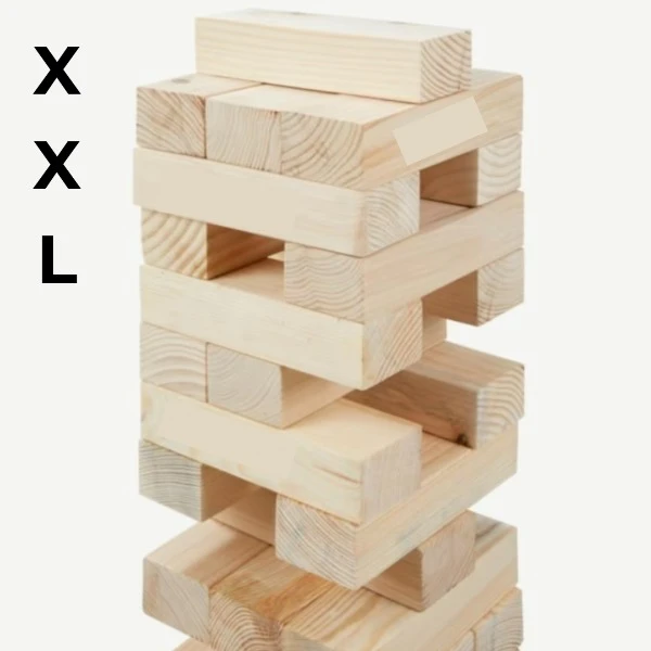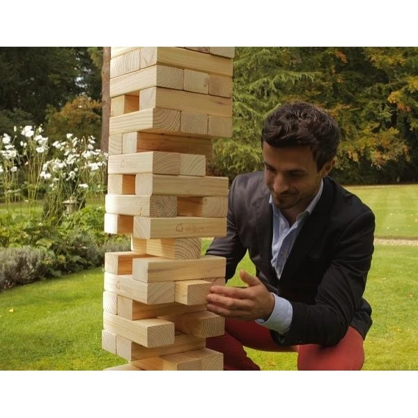 De bedoeling is een blok uit de stapel te halen en deze weer bovenop te leggen. Hierdoor kan de toren tot 150cm hoog worden. Als de toren valt bij jouw beurt, heb je verloren. Het spel kan 1 tegen 1 worden gespeeld, of in teams waarin wordt afgewisseld.