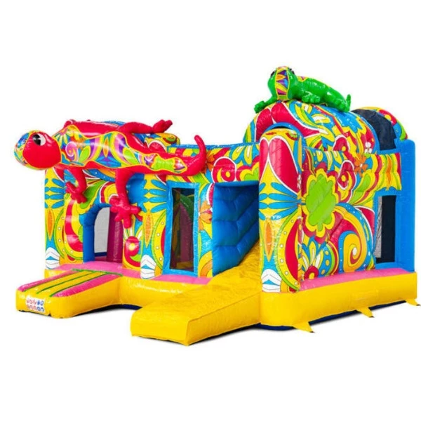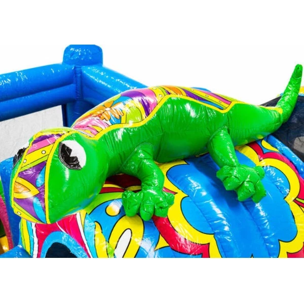 Breng kleur en avontuur naar elk kinderfeestje met de Multiplay paradise island XL! Dit opvallende springkussen is versierd met kleurrijke hagedisen en een speels design dat kinderen direct aantrekt.