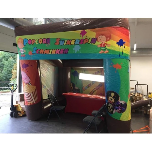 Deze overdekte stent zie je van ver al staan door zijn kleurrijke prints. De kraam is ideaal op te zetten tijdens een evenement of verjaardag. Ideaal te combineren met de (sta)tafels en stoeltjes of natuurlijk de popcornmachine en/of suikerspinmachine.